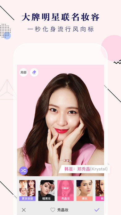 美妝相機(jī)iOS版讓你一秒擁有自然美妝!粉底、眼妝、唇彩、腮紅、修容都能瞬間自動(dòng)搞定,讓你素顏也能一秒拍出好氣色!效果最自然的時(shí)尚妝容!緊跟流行趨勢(shì)的裸妝、韓妝、日系妝等妝容,讓你瞬間擁有超自然美妝效果。另外還有明星妝、搞笑妝讓你一秒變GD,瞬間變蠟筆小新,超好玩哦!百變妝容任你挑選!美妝相機(jī)數(shù)十款精致時(shí)尚妝容,不管你想要甜美風(fēng)、性感風(fēng)、OL風(fēng),都能輕松轉(zhuǎn)換無(wú)壓力哦!“素材中心”還會(huì)定期更新時(shí)下最流行妝容,讓你緊跟當(dāng)季潮流彩妝趨勢(shì)!