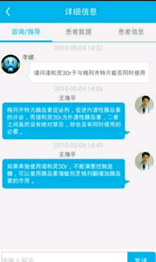 服務(wù)介紹:1.私人醫(yī)生,由醫(yī)生一對(duì)一為患者提供在線服務(wù),患者購(gòu)買私人醫(yī)生服務(wù)后,購(gòu)買服務(wù)的“私人醫(yī)生”可以查看和處理患者的血糖預(yù)警和咨詢信息;2.值班醫(yī)生,由多個(gè)醫(yī)生組成的醫(yī)生服務(wù)團(tuán)隊(duì),患者開通值班醫(yī)生服務(wù)后,該醫(yī)院內(nèi)開通值班醫(yī)生服務(wù)的醫(yī)生都會(huì)受到預(yù)警和咨詢信息。