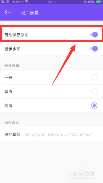 最后點(diǎn)擊“開啟”自動(dòng)保存原圖這一項(xiàng),拍完照就有兩張照片,一張美妝的照片,還有一張?jiān)瓐D照片。