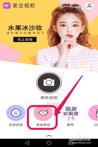 首先我們先打開美妝相機(jī)軟件,打開之后會(huì)進(jìn)入到主面板,如圖所示,此時(shí)單擊面板上的“高級(jí)美妝”選項(xiàng)卡。