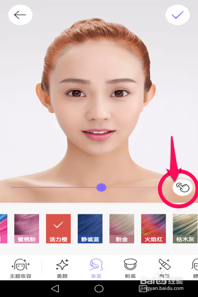 單擊之后會(huì)發(fā)現(xiàn)照片上的頭發(fā)顏色已經(jīng)自動(dòng)變成蜜桃粉了。如果覺得顏色ok的話,可以單擊右上角的“√”保存圖片。如果覺得顏色深淺度還要調(diào)整的話,可以拖動(dòng)下方的調(diào)整線來調(diào)整濃淡