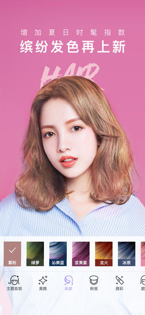 單擊之后會(huì)進(jìn)入到染發(fā)功能面板,在面板的底部會(huì)有好幾種頭發(fā)顏色供我們選擇。比如想試下“蜜桃粉”的話,那么就單擊“蜜桃粉”按鈕。