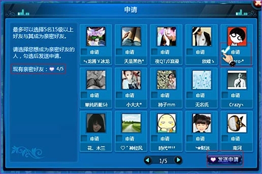 選擇一個好友,在他的頭像下打勾“√”。點發(fā)送申請。(注意哦最多5個親密好友)