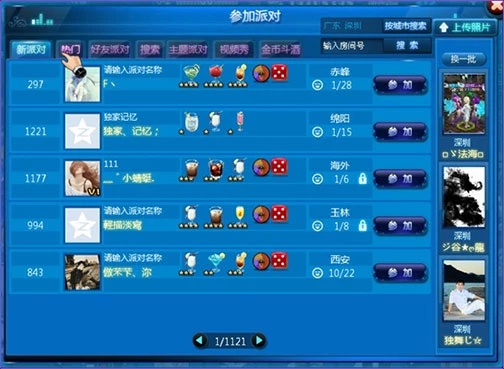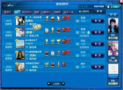 點擊游戲右上的實力派對圖標,可以進入好友和系統(tǒng)的派對。參加派對可以和喜歡的妹紙聊天, 也可以和玩家互動(邀請喝酒、跳舞等),有幾率得到派對積分卡。