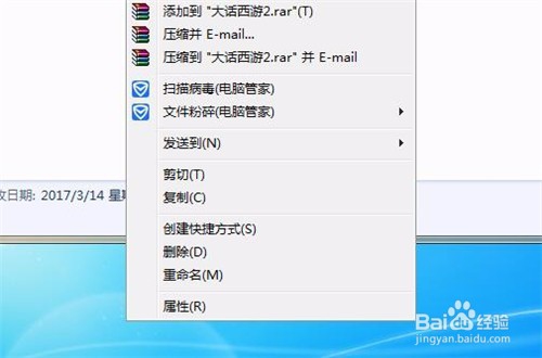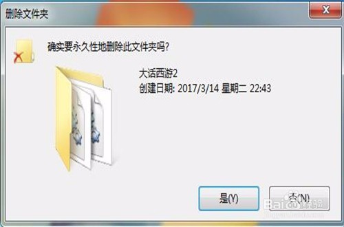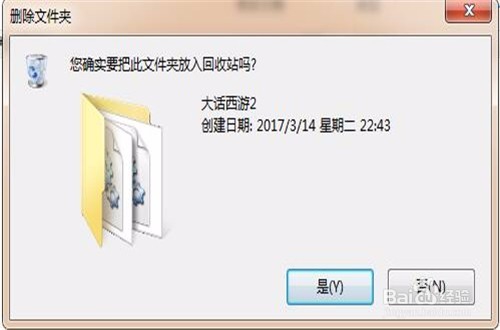2、我們鼠標(biāo)右鍵點(diǎn)擊這個(gè)大話西游2的文件夾,會(huì)彈出一個(gè)選項(xiàng)卡,我們?cè)诶锩纥c(diǎn)點(diǎn)擊“刪除”,彈出一個(gè)確認(rèn)對(duì)話框,點(diǎn)擊“確定”,即可將大話西游2文件刪除到“回收站”。