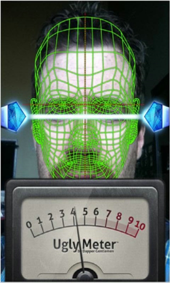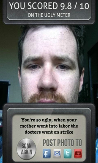 丑臉評分安卓版移植于iPhone平臺,完美移植版本.Ugly Meter丑臉評分”是通過攝像頭掃描人臉來實現(xiàn)評分的,操作起來十分簡單。當(dāng)進(jìn)入到“Ugly Meter丑臉評分”的界面后,只要點擊左下角的男性頭像或和右下角的女性頭像,就會進(jìn)入到軟件的頭像掃描界面。我們既可以通過前置攝像頭給自己拍照,也 可以幫朋友測試,在按下快門之后,軟件便會對頭像進(jìn)行分析和評定,稍后給出評分和評語。