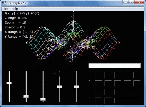 3D Grapher V1.22 英文綠色免費(fèi)版 3DGrapher是一款強(qiáng)大的3D立體圖像制作軟件。它是專門用來繪制數(shù)學(xué)函數(shù)式來做作,當(dāng)你輸入一個(gè)方程式(如f(x,y)=cos(x)+cos(y))之后,可以選擇顯示的顏色、分辨率等。雖然它的功能強(qiáng)大但是他使用起來很方便