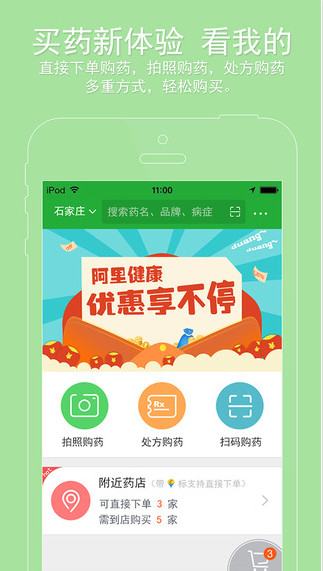 阿里健康app,專為手機用戶開發(fā),用戶隨手拍處方上傳,咨詢藥品信息,由用戶附近多家正規(guī)大型連鎖藥店進行響應(yīng),為用戶提供安全便捷的藥品服務(wù)。平臺已有多家藥店進駐,用戶可查詢藥店地址、電話、營業(yè)時間等信息,查看是否支持醫(yī)保報銷等,用戶根據(jù)實際情況選擇便宜、快捷的藥店。