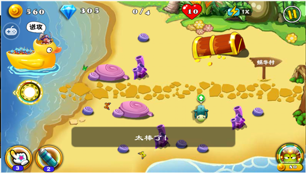 眾多關(guān)卡選擇,你關(guān)卡界面左上方顯示為獎勵鉆石和充值,玩法類似保衛(wèi)蘿卜。