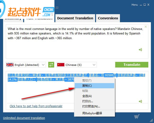 5、這里是babylon pro的文章翻譯界面,可以設(shè)置您需要翻譯的語(yǔ)言,將您的PDF、doc、PPT等放到軟件翻譯