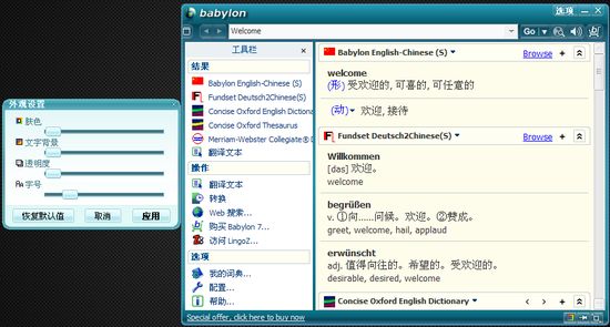 Babylon是一款來(lái)自以色列功能強(qiáng)大的詞典翻譯軟件,在全球已有超過(guò)70個(gè)國(guó)家2千2百萬(wàn)人使用。Babylon Pro 提供最專業(yè)英文翻譯,軟件具有多國(guó)語(yǔ)言翻譯功能,支持中文、日文、英文、德語(yǔ)等不同國(guó)家語(yǔ)言之間互相翻譯,只需輸入需要翻譯的詞語(yǔ),選擇翻譯的語(yǔ)言類型,系統(tǒng)就會(huì)自動(dòng)幫您轉(zhuǎn)換為相應(yīng)的語(yǔ)言翻譯,非常方便快捷,同時(shí)Babylon還具有在線同步翻譯功能,當(dāng)用戶的詞典具有多種語(yǔ)言類型時(shí),您在翻譯一種語(yǔ)言的時(shí)候,系統(tǒng)會(huì)自動(dòng)將所有的語(yǔ)言進(jìn)行翻譯,Babylon還包括了貨幣轉(zhuǎn)換、時(shí)區(qū)轉(zhuǎn)換等功能。Babylon和金山詞霸的最大的不同就在于babylon是基于互聯(lián)網(wǎng)上的應(yīng)用軟件,它充分的利用了互聯(lián)網(wǎng)的特性和資源,在網(wǎng)上不斷出現(xiàn)的新詞匯你都可以通過(guò)babylon找到適當(dāng)?shù)慕忉尅?br />