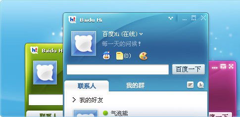 1、百度Hi的主界面及對話框設(shè)計(jì)的相當(dāng)簡潔,顏色搭配也很清新,沒有多余按鈕、沒有彈出廣告、沒有……,而且有多套精美皮膚可選。據(jù)了解,百度方面也會(huì)提供專門的皮膚下載頁。2、百度Hi使用的是passport式ID,而非QQ那種號(hào)碼式,直接用百度ID就可以登錄。也可以選擇關(guān)聯(lián)郵箱,用百度帳戶登錄后,能立即與空間好友聯(lián)系,看到其最新更新。