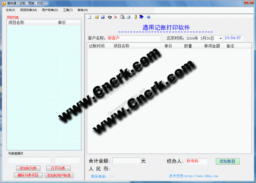 易賬通(通用記賬打印軟件),主要適用于需要管理賬目和打印票據(jù)的商店、超市、飯店、小型企業(yè)、醫(yī)院,重視資產(chǎn)管理的個(gè)人和家庭。軟件可進(jìn)行收支記賬、收支預(yù)算、查看賬目信息、保存賬單、打印賬單、打印收款收據(jù)等功能, 具有單項(xiàng)金額、累計(jì)金額自動(dòng)計(jì)算和人民幣大寫自動(dòng)轉(zhuǎn)換功能;可以使用打印預(yù)覽查看輸出結(jié)果。特別適合于不會(huì)打字的初學(xué)者同樣可以輕松操作。