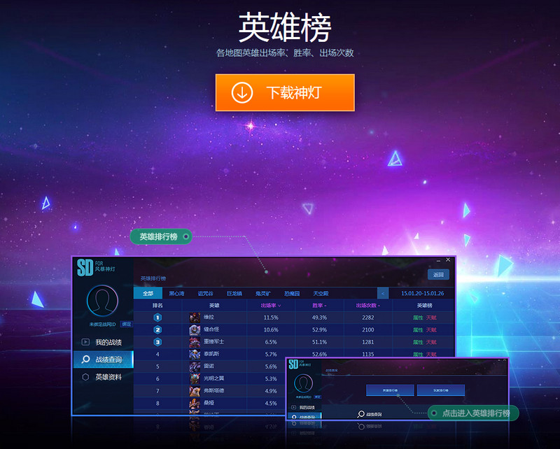 1、戰(zhàn)績(jī)查詢-英雄排行榜,按周使用情況排行,周期為每周二到下周一