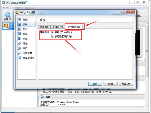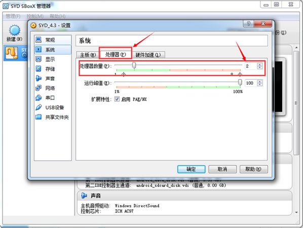 4、進(jìn)入設(shè)置界面后,先系統(tǒng)設(shè)置,在處理器選項(xiàng)的處理器數(shù)量拉到2,硬件加速選項(xiàng)內(nèi)打上勾。再確定保存。