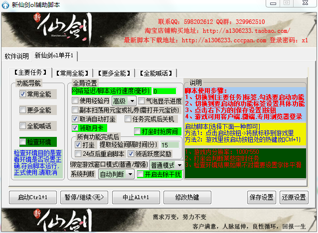 新仙劍OL輔助腳本是新仙劍游戲中的一款綜合輔助工具。該工具擁有自動打坐、副本掃蕩、領(lǐng)取月卡、打坐時間搶房等等主要功能,還擁有多種常用輔助功能,幫助玩家在游戲中可以更加享受。