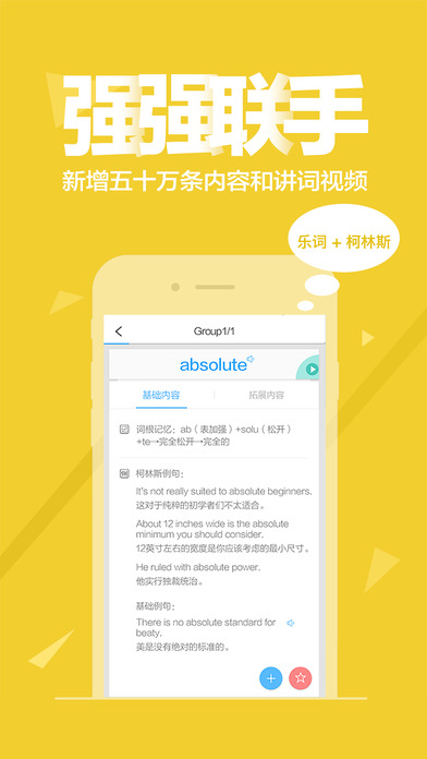 樂詞依靠新東方強大教研力量,將每一個英語單詞在考試中常用的解釋列舉出來,更配合純正發(fā)音、經(jīng)典配圖及真題例句,將每個詞匯解析準(zhǔn)確展現(xiàn)在用戶面前,讓少俠們更高效地背單詞!
