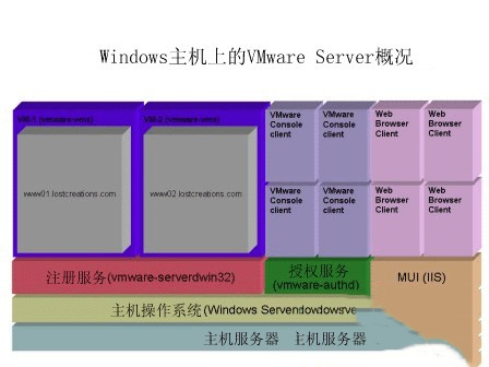VMware Server由安裝在主機操作系統(tǒng)之上的三個主要組件組成。他們分別是注冊服務組件、授權(quán)服務組件和用戶界面管理組件。注冊服務組件負責虛擬機的啟動和停止以及其客戶連接。授權(quán)服務組件負責對從MUI(Windows多語版)和VMware Server控制臺引入的連接進行驗證。MUI允許用戶通過一個Web界面對虛擬機進行管理。