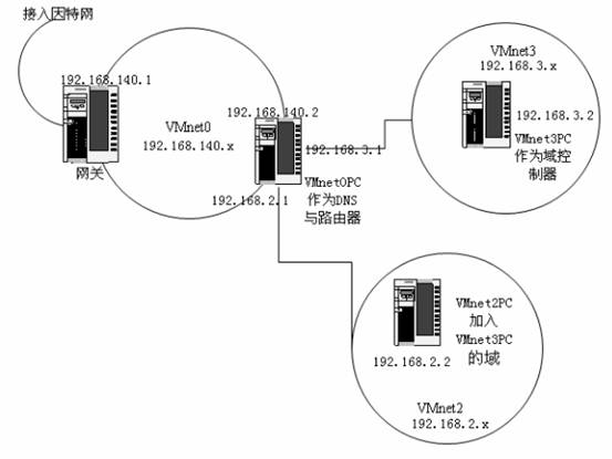 這里首先說一下我們準備構(gòu)建的網(wǎng)絡拓撲。我們的目標是建立兩個定制的子網(wǎng)VMnet2和VMnet3,這兩個網(wǎng)絡與真實主機是不直接相連的(真實主機中我并不添加連接到這兩個網(wǎng)絡的虛擬網(wǎng)卡),而是通過一臺以橋接模式創(chuàng)建的屬于VMnet0的虛擬機連接VMnet0,真實的局域網(wǎng)也即VMnet0通過本地的網(wǎng)關(guān)連接internet,我們將VMnet2的虛擬機稱為VMnet2PC,VMnet3的虛擬機稱為VMnet3PC,VMnet0的PC稱為VMnet0PC,現(xiàn)在把VMnet3PC作為域控制器,VMnet0PC作為路由器和DNS服務器,要求PC和VMnet0PC都加入VMnet3PC建立的域,三個網(wǎng)段要求互聯(lián)互通,并都可以訪問internet。網(wǎng)絡拓撲圖如下:|