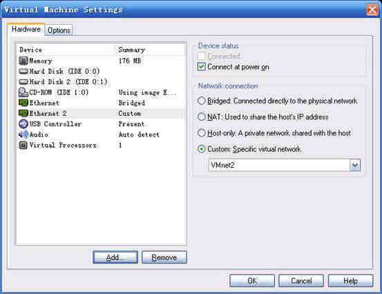 我們在前面的網(wǎng)絡拓撲圖中看到,VMnet0PC應該有三塊不同的網(wǎng)卡分別接入三個不同的虛擬網(wǎng)絡,在建立虛擬機機,VMware已經(jīng)自動添加了一塊接連到VMnet0的虛擬網(wǎng)卡,現(xiàn)在我們?yōu)樗砑觾蓧K分別連接到VMnet2和VMnet3的網(wǎng)卡。