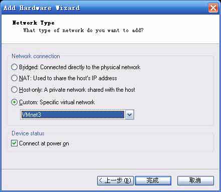 在彈出的硬件添加向?qū)е羞x擇添加網(wǎng)卡,隨后彈出如下所示的對話框,在里面選擇網(wǎng)卡裝要連接的網(wǎng)絡。分別添加兩塊網(wǎng)卡連接到VMnet2和VMnet3。然后在虛擬機中安裝Windows server 2003專業(yè)版操作系統(tǒng)并設(shè)置好橋接網(wǎng)卡以連接到internet打好必要的服務器補丁。至此,第一臺服務器VMnet0PC設(shè)置基本完成并接入了目標網(wǎng)絡。