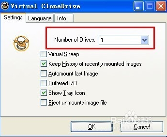 1. 開啟Virtual CloneDrive設(shè)定視窗後,「Number of Drives」欄位可以設(shè)定虛擬光碟機(jī)的數(shù)量,用量不多的話就設(shè)定為「1」,開一臺(tái)使用就好。最多可以設(shè)定到15臺(tái),另外我們也可勾選「Automount last Image」,讓Virtual CloneDrive自動(dòng)掛載上次使用過的光碟映像檔,方便我們快速取用映像檔中的資源,如果勾選上面的「Virtual Sheep」選項(xiàng),「我的電腦」視窗里的虛擬光碟機(jī)圖示會(huì)變成Virtual CloneDrive軟體的羊頭圖示,便於跟其它光碟機(jī)在視覺上作區(qū)隔。