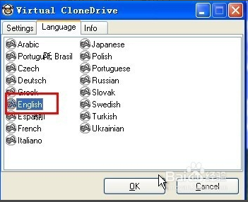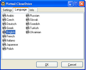 2.Language設(shè)定頁簽中,可以挑選不同的軟體語言介面,不過目前12種語系中,還沒有繁體中文版本的語系,日後如有找到中文語系檔的話,可以直接把它放到「C:\Program Files\Elaborate Bytes\VirtualCloneDrive\Texts」資料夾中,再到這個(gè)設(shè)定頁面中點(diǎn)選,就可以切換成中文版來使用。