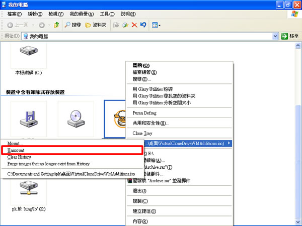 5.上述是將光碟映像檔掛載到Virtual CloneDrive,如果要卸除光碟映像檔的話,可以在Virtual CloneDrive虛擬光碟機(jī),點(diǎn)擊滑鼠右鍵,再點(diǎn)選[Virtual CloneDrive] > [Unmount],便可將掛載的光碟映像檔卸除。