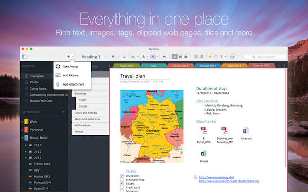 Outline是Mac OS平臺上一款非常好用的記事本軟件,該軟件擁有和紙質(zhì)記事本一樣的特性,含有筆記本、 節(jié)、 分區(qū)和頁的組等功能,同時Outline還支持與Windows PC 和其他設(shè)備同步,有效的提高你的辦公效率。