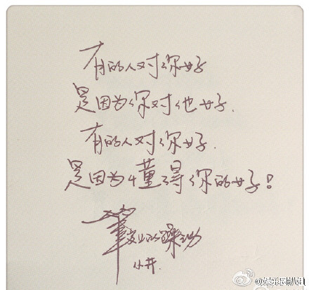知名娛評人“倪大叔叔”通過其微博爆料稱,“井柏然的字體被某字庫看重,正在溝通購買事宜,別以為買字體是小買賣,這版權(quán)至少價值300萬!井柏然真的賣的話,他至少需要寫3000個常用漢字。仔細(xì)想想,每個字1000塊,一字千金原來是真的”一直以來,井柏然堅持用“手寫微博”記錄生活感悟,清秀的字體、頻爆的金句展示了他的才華。昨日,知名娛評人“倪大叔叔”通過其微博爆料:“井柏然的字體被某字庫看重,正在溝通購買事宜……版權(quán)至少價值300萬!井柏然真的賣的話,至少需要寫3000個常用漢字。仔細(xì)想想,每個字1000元,一字千金也是醉了!”此條微博發(fā)出后,立即引發(fā)網(wǎng)友圍觀。甚至有網(wǎng)友調(diào)侃稱:“井寶的字體以后可直接命名為井體,然后我們隨便打開一個Word,就可以找到了!”