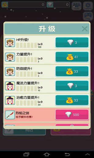 金幣和鉆石都可以用來提升屬性,三次金幣提升后就要用一次鉆石提升,然后又三次金幣又一次鉆石的循環(huán),另外本游戲前一百層的神器烈焰之劍售價(jià)是500鉆石,少年在第五層就刷出來了喲~~~效果是點(diǎn)燃怪,也就是持續(xù)傷害啥的,是否對普攻有加成,未判別,不過武器騷包程度上市有加成的。
