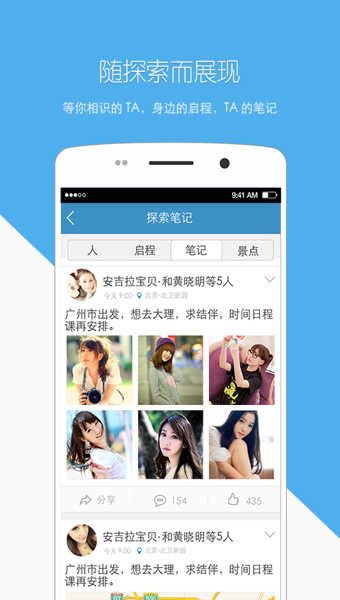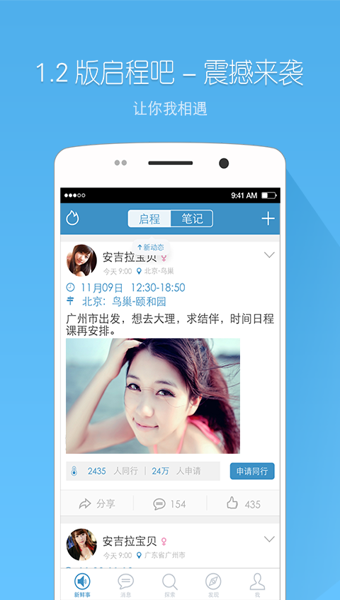1、發(fā)布啟程,邀約小伙伴們一同出行精神煥發(fā);2、申請同行,加入別人的啟程,出行不必曾相識;