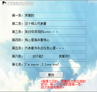 為你傾心強(qiáng)大表白軟件是一款用于將自己想表白的話語(yǔ)通過(guò)軟件的方式,生成一段浪漫動(dòng)態(tài)的動(dòng)態(tài)文件發(fā)送給暗戀的軟件,軟件支持表白信息的更改(包括全屏愛(ài)心,給你的信,和表白內(nèi)容)等信息,在發(fā)給你想要表白的對(duì)象時(shí),將主程序(為你傾心),為你傾心音樂(lè)(文件夾),為你傾心bin(配置文件夾),壓縮在一起發(fā)送給對(duì)方。【為你傾心強(qiáng)大表白軟件使用】