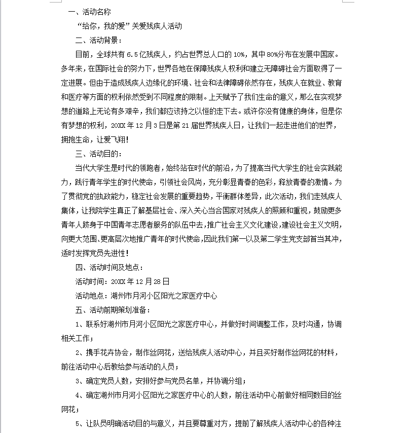 在校園內(nèi)大力宣傳此次活動的目的,并且在學(xué)生和老師中為殘疾人募捐,要著重預(yù)備黨員和黨員的募捐;