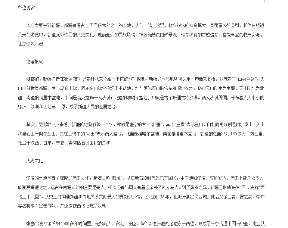 游客們,新疆神奇在哪里?首先還是讓我來介紹一下它的地理概貌。新疆的地形地勢可以用一句話來概括,這就是“三山夾兩盆”。天山山脈橫貫新疆,南與昆侖山脈、阿爾金山脈合抱塔里木盆地,北與阿爾泰山脈合抱準噶爾盆地。俗稱天山以南為南疆,天山以北為北疆。南疆的塔里木盆地,中間是塔克拉瑪干大沙漠;北疆的準噶爾盆地,中間是古爾班通古特沙漠。兩大沙漠周圍,分布著大大小小的綠洲。綠洲和山地草 原,成了新疆人民的世居之地。其實,更形象一點來看,新疆的地貌就像一個字,那就是疆字的右半部“畺”,其中“三橫”表示三山,自北而南分別是阿爾泰山、天山和昆侖山一阿爾金山,夾在三橫中的“兩田”表示兩大盆地,北面是準噶爾盆地,南面是塔里木盆地。新疆的總面積為160多萬平方公里,相當于陜西、甘肅、寧夏、青海四省區(qū)面積的總和。