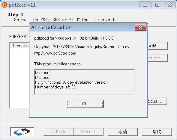 1、首先開始解壓縮包,然后運(yùn)行原文件“current-pdf2cad.exe”,根據(jù)系統(tǒng)默認(rèn)即可快速完成安裝2、在安裝完成后第一次登陸軟件,會(huì)發(fā)現(xiàn)時(shí)間限制30天。