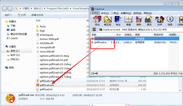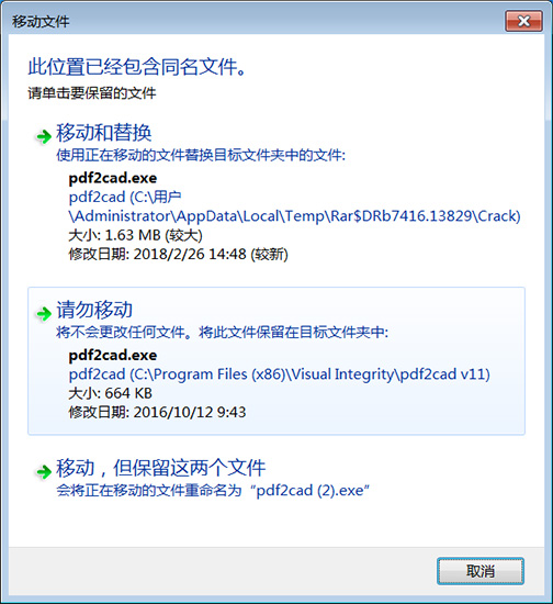3、然后找到壓縮包Crack內(nèi)的文件pdf2cad.exe,移動(dòng)復(fù)制到原軟件安裝目錄C:\Program Files (x86)\Visual Integrity\pdf2cad v11,選擇復(fù)制和替換,即可