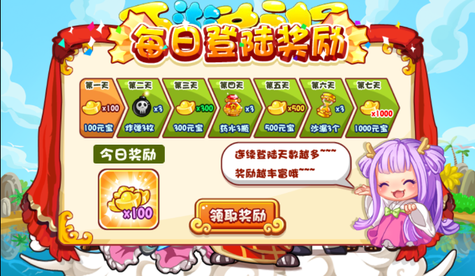 每天第一次登錄都可以領(lǐng)取登錄獎勵,連續(xù)登陸天數(shù)越多,獎勵越豐富