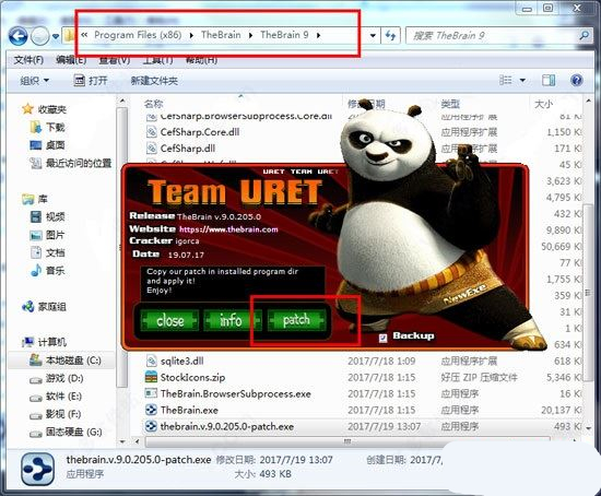 3、將TheBrain9破解工具“thebrain.v.9.0.205.0-patch.exe”復(fù)制到安裝目錄下運(yùn)行,然后點(diǎn)擊“Patch”即可,默認(rèn)安裝目錄為C:\Program Files (x86)\TheBrain\TheBrain 9