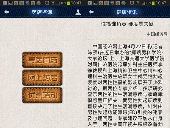 3、全國連鎖網(wǎng)上藥店查詢及咨詢電話鏈接(全國數(shù)十家網(wǎng)上藥店介紹,藥品信息及最新活動展示等功能,同時提供一鍵呼出功能,可以向網(wǎng)上藥店進行電話咨詢),最終有利于男性疾病患者用藥安全和大眾健康。