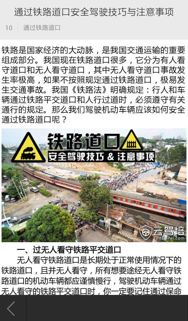 云駕培-駕駛員考試網(wǎng)絡(luò)學(xué)習(xí)平臺(tái),是一個(gè)為駕駛初學(xué)者、汽車(chē)駕駛員和駕駛培訓(xùn)機(jī)構(gòu)服務(wù)的專(zhuān)業(yè)型服務(wù)學(xué)習(xí)平臺(tái)。嚴(yán)格按照最新《機(jī)動(dòng)車(chē)駕駛培訓(xùn)教學(xué)與考試大綱》編排課程,包含最新駕校考試科目一、科目二、科目三全部理論學(xué)習(xí)課程和實(shí)際操作課程,以豐富生動(dòng)的學(xué)車(chē)駕考圖文教程和視頻講解,直觀詳細(xì)地講解駕考知識(shí)和駕駛操作技能...