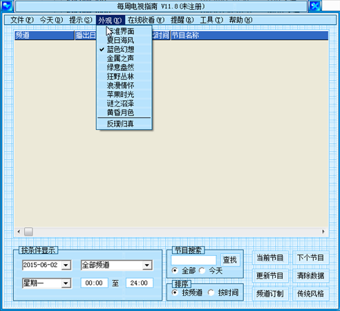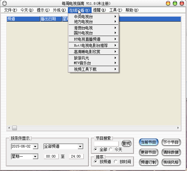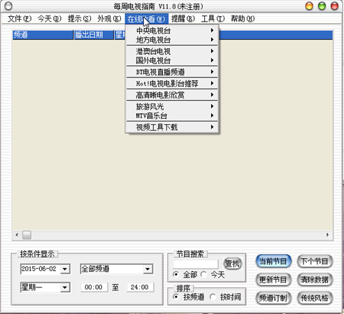 每周電視指南讓你不錯(cuò)過任何精彩的電視節(jié)目,它利用了互聯(lián)網(wǎng)的便捷性和數(shù)據(jù)庫的強(qiáng)大查詢功能,使你可以方便地下載最近兩周的電視節(jié)目表并選定自己最喜歡看的內(nèi)容。在線網(wǎng)絡(luò)電視功能,讓你不裝衛(wèi)星天線也能收看到最新港劇、臺(tái)灣綜藝,各大體育賽事。支持皮膚選擇,界面更漂亮?!睹恐茈娨曋改稀芬彩瞧駷橹箛?guó)內(nèi)第一款可同時(shí)收看網(wǎng)絡(luò)電視和查看電視節(jié)目表的軟件。