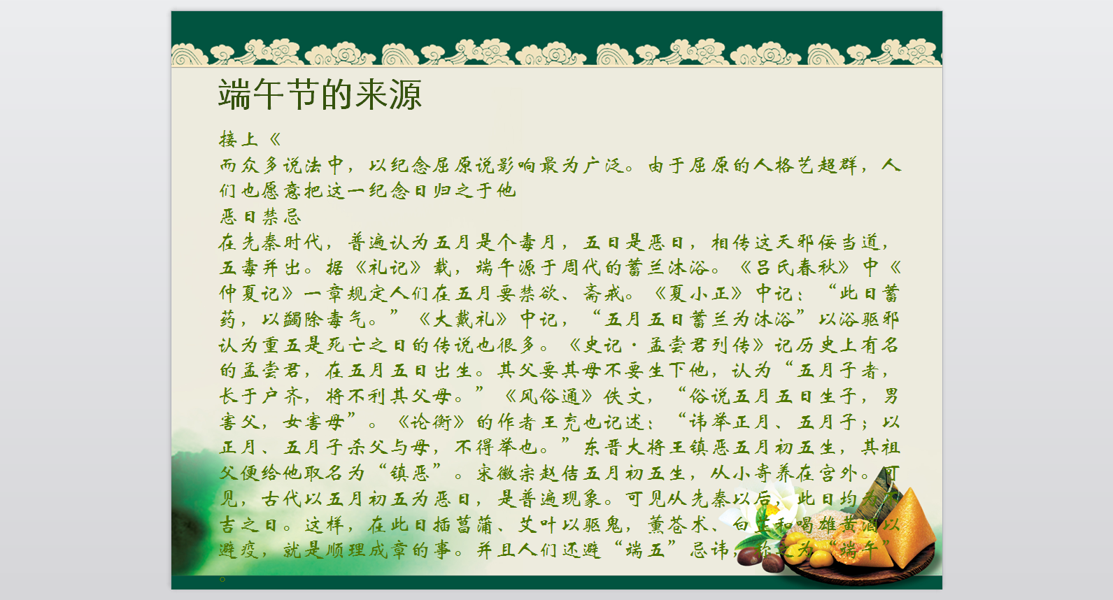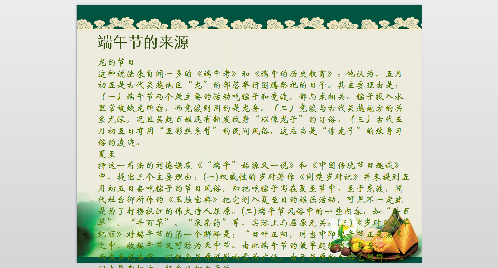 端午節(jié)的由來PPT模版 免費(fèi)版 這是一份介紹端午節(jié)由來的PPT模版,模版以粽子這個(gè)端午節(jié)的標(biāo)志物為背景圖片,突出主題。整篇PPT主要采用了文字?jǐn)⑹龅男问浇榻B了兩個(gè)不同的端午節(jié)的由來,并輔以圖片,使得整個(gè)模版更加生動(dòng)形象。此模版適用于各種介紹端午節(jié)的場(chǎng)合使用,喜歡的朋友可以下載下來哦。