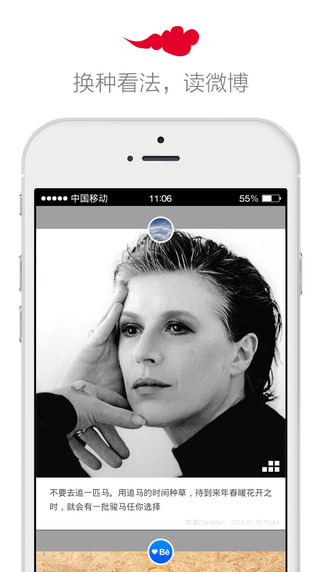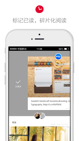 進入應(yīng)用之后,卡片式顯示方式就已經(jīng)盡顯個性所在,紅與黑的經(jīng)典配色也十分舒服亮眼。首頁呈現(xiàn)的是所有我們關(guān)注的微博內(nèi)容,配圖默認顯示第一張,點擊詳情界面之后,微博內(nèi)容會像一篇文章一樣,下翻至底部可以看到轉(zhuǎn)發(fā)和評論數(shù),點擊紅色「√」為已讀,此微博就會從你的首頁消失,避免出現(xiàn)重復(fù)閱讀的情況。