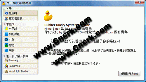 人見(jiàn)人愛(ài)的Rubber Ducky 橡皮鴨是一款有趣的免費(fèi)系統(tǒng)檢測(cè)軟件。免費(fèi)的它以魚(yú)缸的形式出現(xiàn)在系統(tǒng)托盤(pán)上。電腦的情況被反映在魚(yú)缸里,其中魚(yú)類(lèi)代表網(wǎng)絡(luò)情況,植物代表硬盤(pán),水泡代表CPU使用率,水的顏色和水位代表內(nèi)存情況。