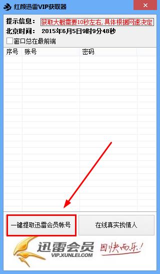1、下載解壓后,直接運行紅顏迅雷VIP獲取器,點擊【一鍵提取迅雷會員賬號】