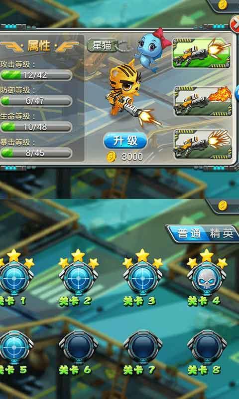 星貓突擊隊(duì)游戲中我們可以選擇三個(gè)角色,分別是星貓、卷毛、大牌,它們除了外形不同之外,在武器裝備上的配置也有所不同,只不過(guò)唯一可惜的是后面兩個(gè)角色都需要付費(fèi)解鎖,比較坑。游戲?yàn)橥婕覀兲峁┝擞⑿鄢砷L(zhǎng)的過(guò)程,我們可以用金幣對(duì)自己的英雄進(jìn)行強(qiáng)化升級(jí),通過(guò)提升攻擊、防御、血量、速度等屬性來(lái)提升戰(zhàn)斗力,這種有針對(duì)性的強(qiáng)化對(duì)人物的成長(zhǎng)以及戰(zhàn)場(chǎng)需求都是極有利的表現(xiàn)。游戲?yàn)橥婕覀儨?zhǔn)備了三種挑戰(zhàn)模式,分別是冒險(xiǎn)模式、挑戰(zhàn)模式、生存模式。冒險(xiǎn)模式主要以闖關(guān)挑戰(zhàn)為主,也是比較常見的模式;挑戰(zhàn)模式則是挑戰(zhàn)不同的限制任務(wù),鍛煉玩家們的戰(zhàn)場(chǎng)應(yīng)變能力;最后的生存模式一看名字都知道了,只要不死就一直戰(zhàn)斗下去,挑戰(zhàn)分?jǐn)?shù)排行榜。游戲?yàn)橥婕覀儙?lái)的三種模式各有自己的意義,玩家們可以根據(jù)自己的喜好進(jìn)入不同的戰(zhàn)斗中,不斷提升自己的戰(zhàn)斗實(shí)力。