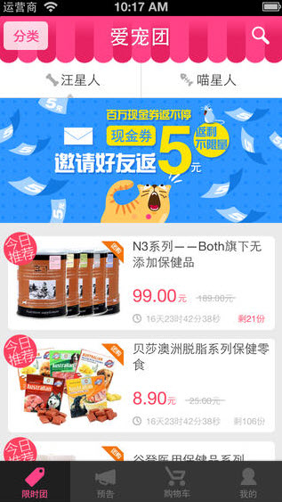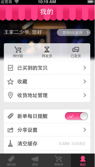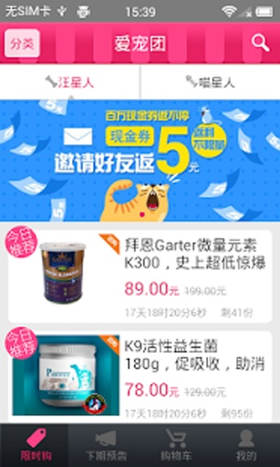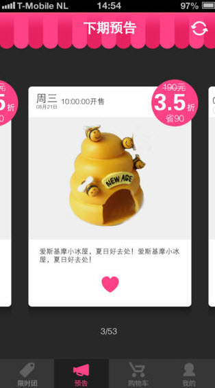 末端分別有四個欄目:限時購、下期預(yù)告、購物車、我的,非常便捷
