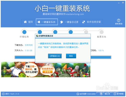 4、軟件開始下載系統(tǒng)文件,具體時(shí)間根據(jù)個(gè)人的網(wǎng)絡(luò)帶寬各異。下載完畢后會(huì)彈出一個(gè)提示框,選擇是則進(jìn)入重啟安裝,否則取消安裝。如果20秒沒有選擇操作軟件則自動(dòng)選擇重啟安裝。
