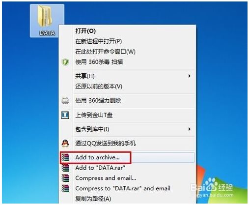 5、然后創(chuàng)建一個名為“DATA”的文件夾,將“Characters”文件夾放入其中,右擊“DATA”文件夾,從彈出的右鍵菜單中選擇“添加壓縮文件(Add to Archive)”項。